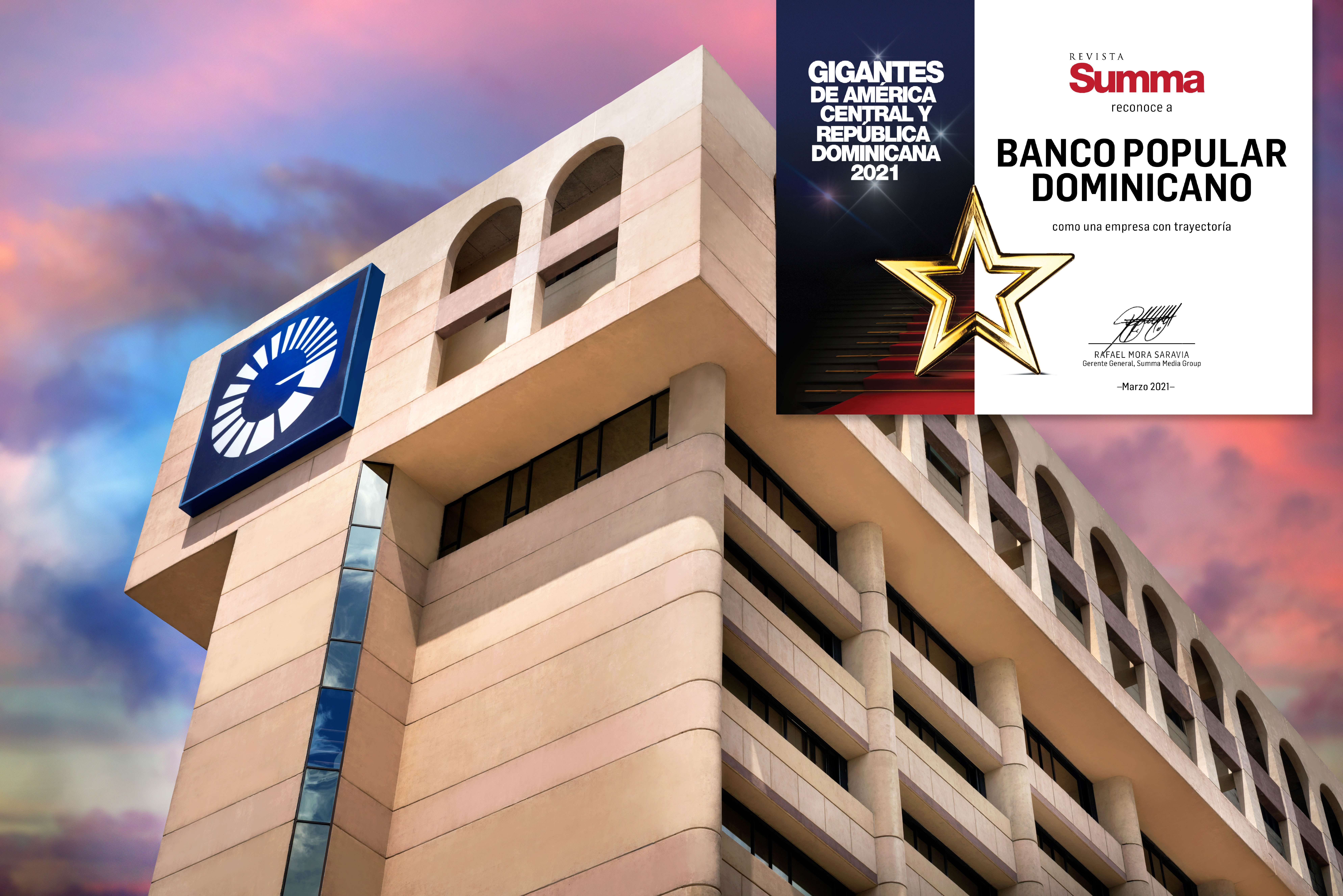 La revista de negocios Summa, en su edición de marzo "Gigantes de América Central y República Dominicana", eligió al Banco Popular Dominicano por su trayectoria, liderazgo institucional y por ser una empresa referente.
